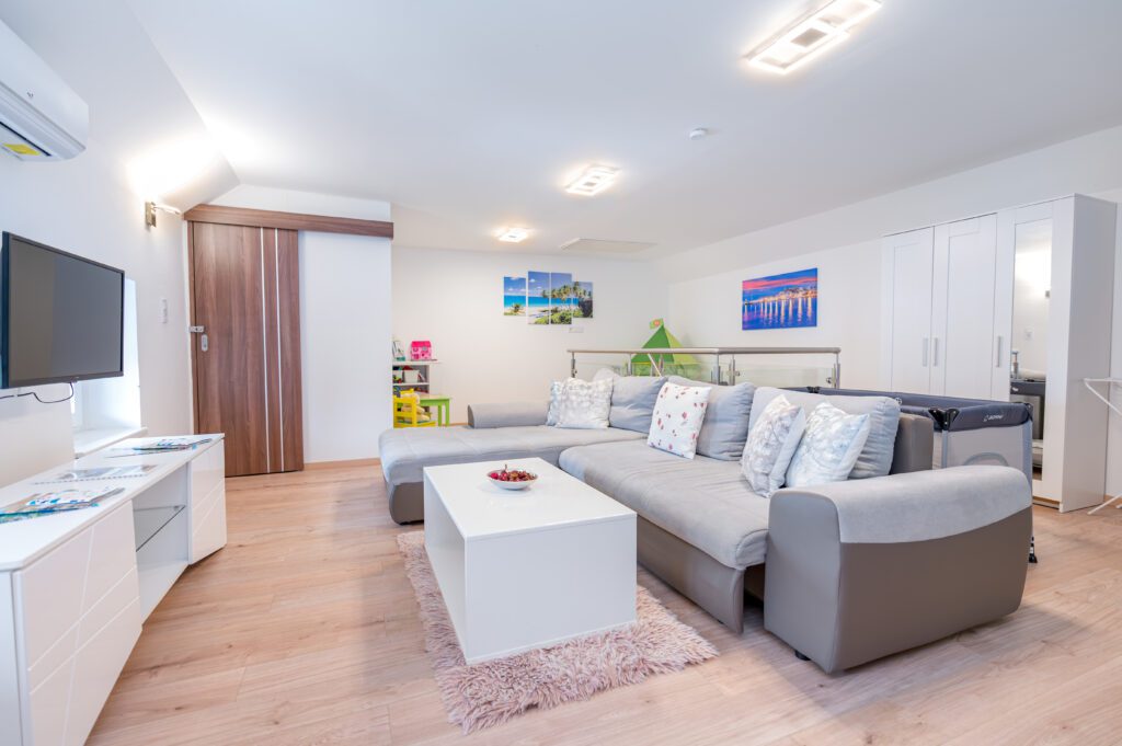 - 44 négyzetméteres nappali, gyereksarokkal, kanapéval és kanapé ággyal (pótágy)